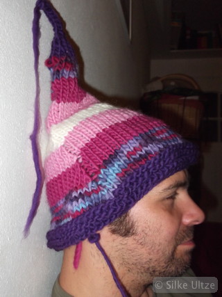 Ich hab´mich richtig in´s Zeug gelegt, heute ist sie quasi fertig geworden (bis auf´s Bündchen für rund ums G´sicht) – Anprobe: viiiiel zu groß, es ist voll mit mir durchgegangen… Nun muss ich von oben her nochmal auftrennen und das letzte Stück neu und ein bissi anders stricken. (Und habe leider prompt keine Lust mehr, weil´s ja nicht so geklappt hat wie geplant. Schmoll.)
