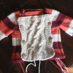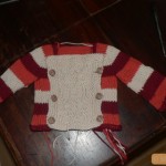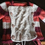Der wirklich interessante Teil kommt leider erst zum Schluss, wenn Ärmel und alles andere zusammen auf einer Nadel zur Rundpasse mit viel Gezopfe gestrickt werden. Darauf freue ich mich bereits. Und wenigstens strickt sich das Garn wie Butter, herrlich! Ich habe nur keine Ahnung was es ist. Ich hab´s in den Flitterwochen auf Madeira gekauft, es war Strangware ohne Etikett. So weiss ich noch nicht mal, ob´s Viech oder Erdöl ist… Sollte ich ein bisschen übrig behalten (was echt superknapp werden wird!), mach ich mit einem Läppchen eine 60° Filzprobe. Mal sehen.